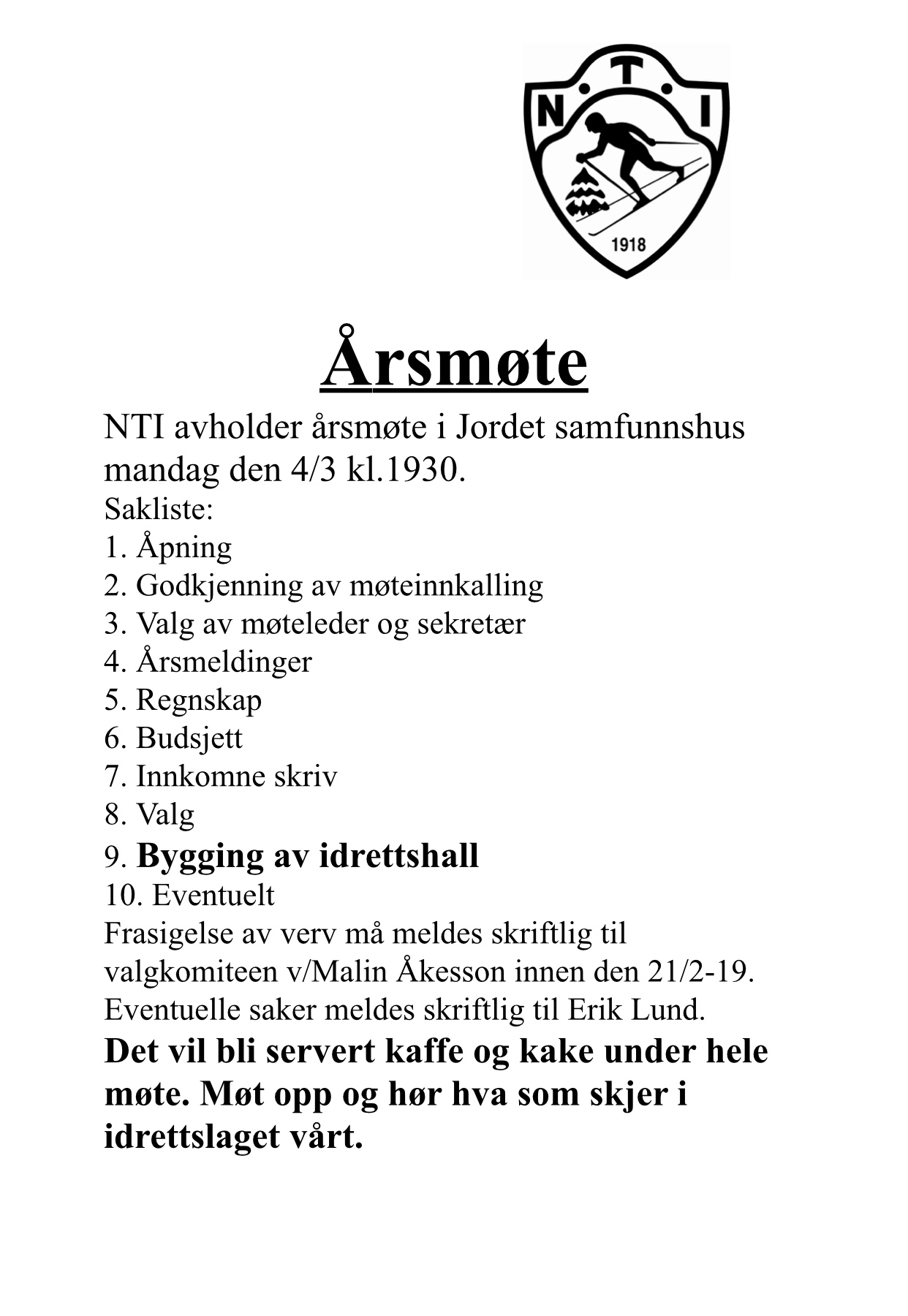 NTI ønsker velkommen til årsmøte. Håper på mange fremmøtte. En «stor» sak står på sakskartet ?