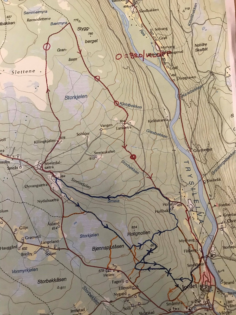 Nr.1/blå er Hollgnollrunden. Den går rundt Omformern, ned til holla, opp Smeiedalen og Pilgrimsleden ned til Jordet igjen - ca.15 km. Turen kan forkortes mange steder.
