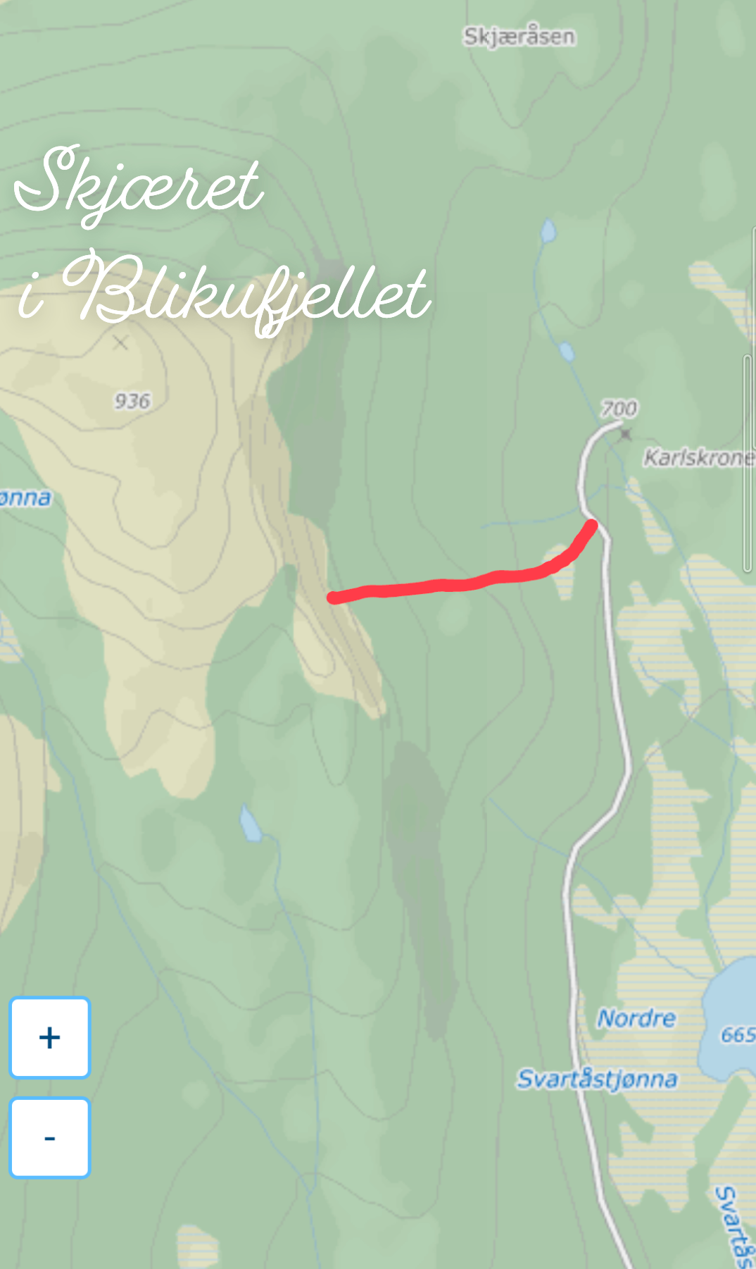 Kjør Togmyrvegen til bommen (50,- i avgift), fortsett videre på Blikufjellvegen. Ca 250 m før Karls Krone (vegs ende), går stien opp til venstre. Stien er merket med blå bånd. Ca 50 m lenger bort, kan bilen parkeres på høyre side av vegen( henger et blått bånd der også).