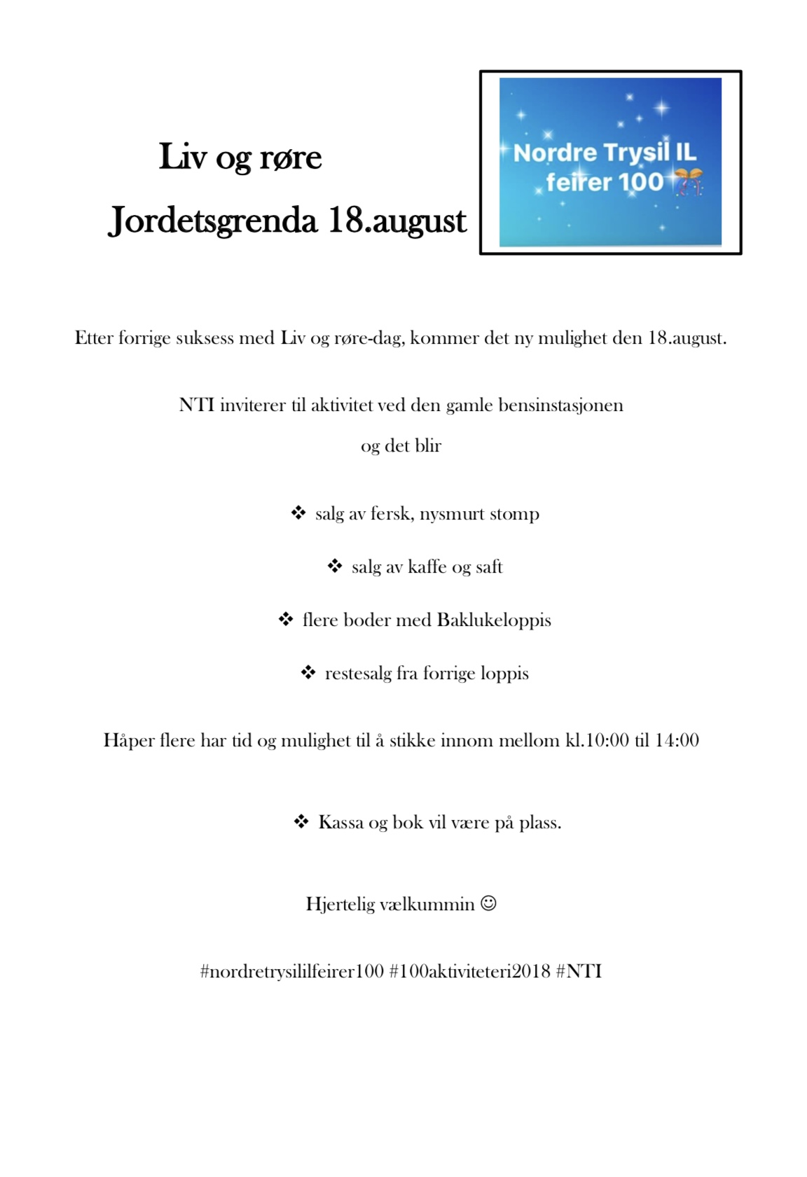 Velkommen til Liv og røre 18.august Skrevet av Wenche Holdbak 10. august 2018. Publisert i NTI 100 år Salg av fersk stomp, kaffe, kaker og loppis. Mange stiller på baklukeloppisen ?
